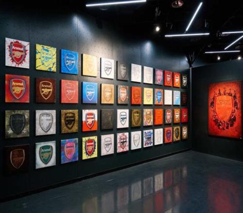 徽章系列既是致敬,也是再创。艺术家海登·波恩用他颠覆性的视觉语言,将沉甸甸的荣耀与记忆,燃成观众眼前流动的火焰。在徽章子系列作品中,最为震撼的当属《Arsenal》。它由48件小幅徽章作品搭配1件大幅徽章作品,共同组成“49”矩阵,在展厅墙面整齐排布。“49”对阿森纳而言具有特殊意义,它象征着俱乐部在“无敌赛季”期间创下的历史性连续不败纪录,这一纪录至今无人超越。而《传承》《流行》《街头》《特别版》等子系列,则分别运用岁月肌理、波普色彩、街头涂鸦乃至中国祥云龙纹,为阿森纳徽章书写下跨越时间与文化的多重注脚。