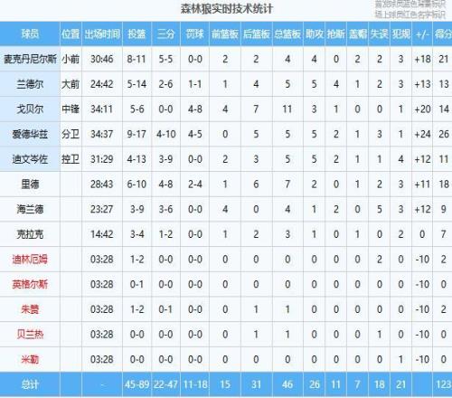 森林狼:爱德华兹26分5板5助2断、麦克丹尼尔斯21分4板4助2帽、里德18分7板2助、戈贝尔14分11板3助、兰德尔13分5板5助4断、迪文岑佐11分5板5助2断
