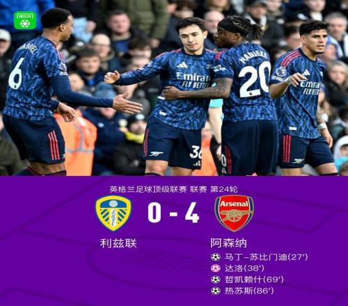 北京时间1月31日英超联赛第24轮,利兹联主场对阵阿森纳。赛前萨卡热身受伤,上半场,首发登场的马杜埃凯表现亮眼,他先是助攻苏比门迪头球破僵,随后又通过角球造成达洛自摆乌龙。下半场,替补登场的马丁内利助攻哲凯赖什扩大领先,同样替补登场的厄德高助攻热苏斯锁定胜局。最终,阿森纳客场4-0大胜利兹联,先赛一场7分领跑。